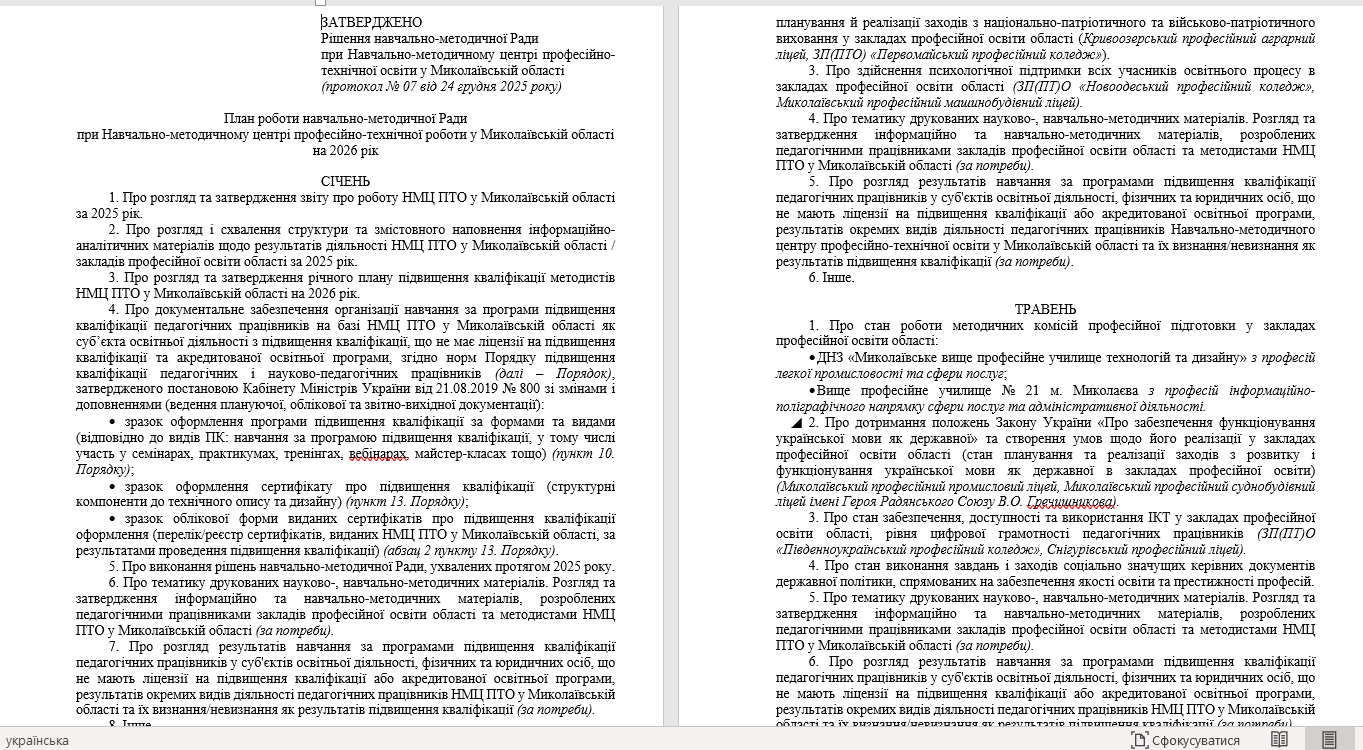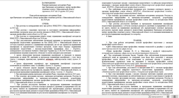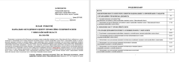 Протягом грудня 2025 року методистами НМЦ ПТО у Миколаївській області здійснено роботу щодо планування перспективних напрямів роботи та способів їх реалізації протягом 2026 року. Діяльність НМЦ ПТО у Миколаївській області спрямована на результат, цілепокладання, постановку на основі цільових потреб особистісно-орієнтованих завдань, точне планування у форматі довго-, середньо- та короткострокового періодів та з урахуванням можливостей для участі як в системних, так і несистемних явищах. При плануванні роботи на 2026 рік застосовувався системний і комплексний підходи з урахуванням принципів єдності, безперервності, гнучкості, точності та участі кожного. ![]() Спроєктована діяльність НМЦ ПТО у Миколаївській області на наступний рік – це результат процесу цілеспрямованого планування, при якому враховувався (з обґрунтуванням) ієрархічність у формуванні напрямів діяльності, можливості для реалізації керівних документів державної політики (доктрини, концепції, стратегії, програми, національні проєкти, плани), здійснюється аналіз чинних та проєктованих керівних документів державної політики в освітній сфері за видами, їх сприйняття учасниками освітнього процесу як системного підходу та рівень готовності педагогічних працівників до реалізації завдань державної політики у сфері освіти, зокрема – цифрової трансформації процесу навчання. ![]() У процесі планування окрема увага (наскрізна лінія) зосереджена на реалізацію напрямів та завдань, визначених Міністерством освіти і науки України спільно з Державною службою якості освіти України, саме в частині детального аналізу та вдосконалення компонентів внутрішньої системи забезпечення якості освіти в закладах професійної освіти області (практичні аспекти застосування орієнтовних критеріїв оцінювання освітніх і управлінських процесів закладу професійної (професійно-технічної) освіти та внутрішньої системи забезпечення якості освіти) (наказ Міністерства освіти і науки України від 06 травня 2021 року № 509 «Про затвердження Методичних рекомендацій з питань формування внутрішньої системи забезпечення якості освіти у закладах професійної (професійно-технічної) освіти»). ![]() З метою реалізації даного напряму роботи змістовне наповнення заходів обласного рівня спрямоване на забезпечення ресурсно-методичної та організаційної підтримки діяльності закладів професійної освіти області в частині: ● використання професійно-орієнтованого оцінно-рефлексивного інструментарію для детального аналізу компонентів внутрішньої системи забезпечення якості освіти в загальній системі самооцінювання освітніх та управлінських процесів, визначення спроможності закладів професійної освіти області надавати освітні послуги; ● інформаційно-роз’яснювальної роботи щодо оптимальних, індивідуально-орієнтованих шляхів удосконалення показників (згідно індикаторів ефективності), які безпосередньо впливають на якість результатів освітнього процесу, формування ключових і професійних компетентностей здобувачів освіти та підвищення інституційної спроможності закладів професійної (професійно-технічної) освіти області до ефективної реалізації державної політики, спрямованої на якісне надання освітніх послуг. ![]() В комплексній структурі проєктування змісту обласних заходів серед напр